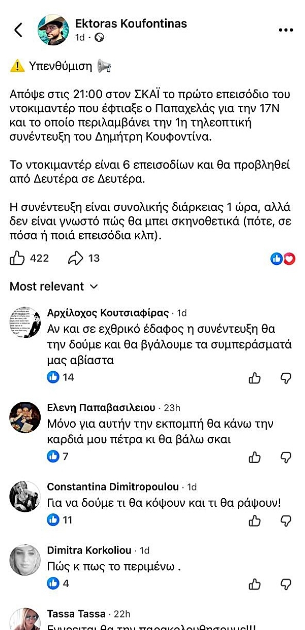Με ανάρτηση που τιτλοφορείται «Υπενθύμιση», ενημερώνει για την ώρα προβολής του πρώτου επεισοδίου και επισημαίνει ότι το ντοκιμαντέρ περιλαμβάνει «την 1η τηλεοπτική συνέντευξη του Δημήτρη Κουφοντίνα». Δεν πρόκειται για μια απλή αναφορά. Στο βίντεο που ανάρτησε, εμφανίζεται να παρακολουθεί την εκπομπή στον ΣΚΑΪ, την ώρα που προβάλλονται τα εγκλήματα της 17Ν, τρώγοντας πίτσα και πίνοντας μπίρα, σαν να πρόκειται για μια ακόμη τηλεοπτική σειρά ψυχαγωγίας.