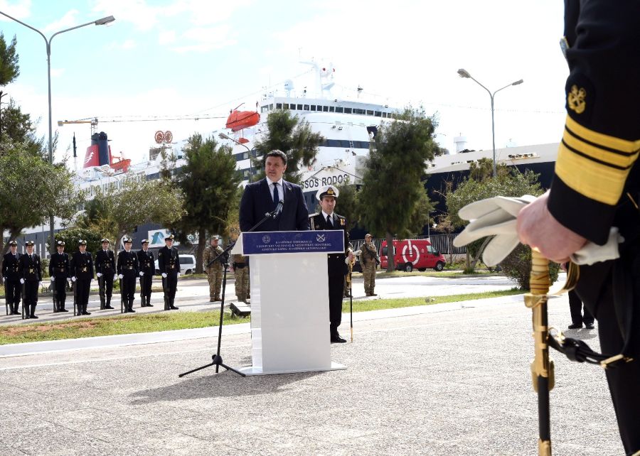 Στον χαιρετισμό του, ο Υπουργός Ναυτιλίας υπογράμμισε ότι το Λιμενικό Σώμα αποτελεί τον επιχειρησιακό βραχίονα της θαλάσσιας ασφάλειας της χώρας και ανακοίνωσε την ενίσχυση με νέο εξοπλισμό και τεχνολογία αιχμής.