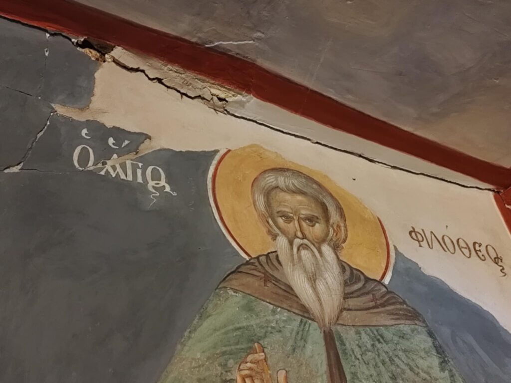 Το κλιμάκιο της Εφορείας κατά την αυτοψία στο παλαιό καθολικό, μνημείο, του τέλους του 10ου αιώνα, κατάγραφο με τοιχογραφίες του 16ου αιώνα, διαπίστωσε ότι ο σεισμός προκάλεσε έντονες ρωγμές στους τρούλους, τόσο στον κυρίως ναό, όσο και στη λιτή, ενεργοποιώντας και τις παλαιές ρωγμές, κυρίως σε τόξα που είχαν κλείσει. Οι ρωγμές, στις εσωτερικές τοιχογραφημένες επιφάνειες, προκάλεσαν, σε κάποια σημεία, ακόμα και αποκολλήσεις του ζωγραφικού στρώματος, έως και περιορισμένης κλίμακας πτώσεις επιχρισμάτων, με τοιχογραφίες. Αρκετές από αυτές τις ζημίες είχαν προκληθεί από τον σεισμό της 15ης Φεβρουαρίου 2025, ωστόσο με τον πρόσφατο σεισμό παρουσιάστηκε επιδείνωση. Η Εφορεία, άμεσα, μετά τις φθορές του σεισμού της 15ης Φεβρουαρίου, με συνεργεία συντηρητών είχε εφαρμόσει σωστικά μέτρα επί των τοιχογραφιών σε σημεία που προκλήθηκαν οι ρωγμές, προκειμένου να συγκρατηθούν αποκολλημένες ζωγραφικές επιφάνειες. Με την ενέργεια αυτή απετράπησαν οι, μεγαλύτερης έκτασης, φθορές των τοιχογραφιών.