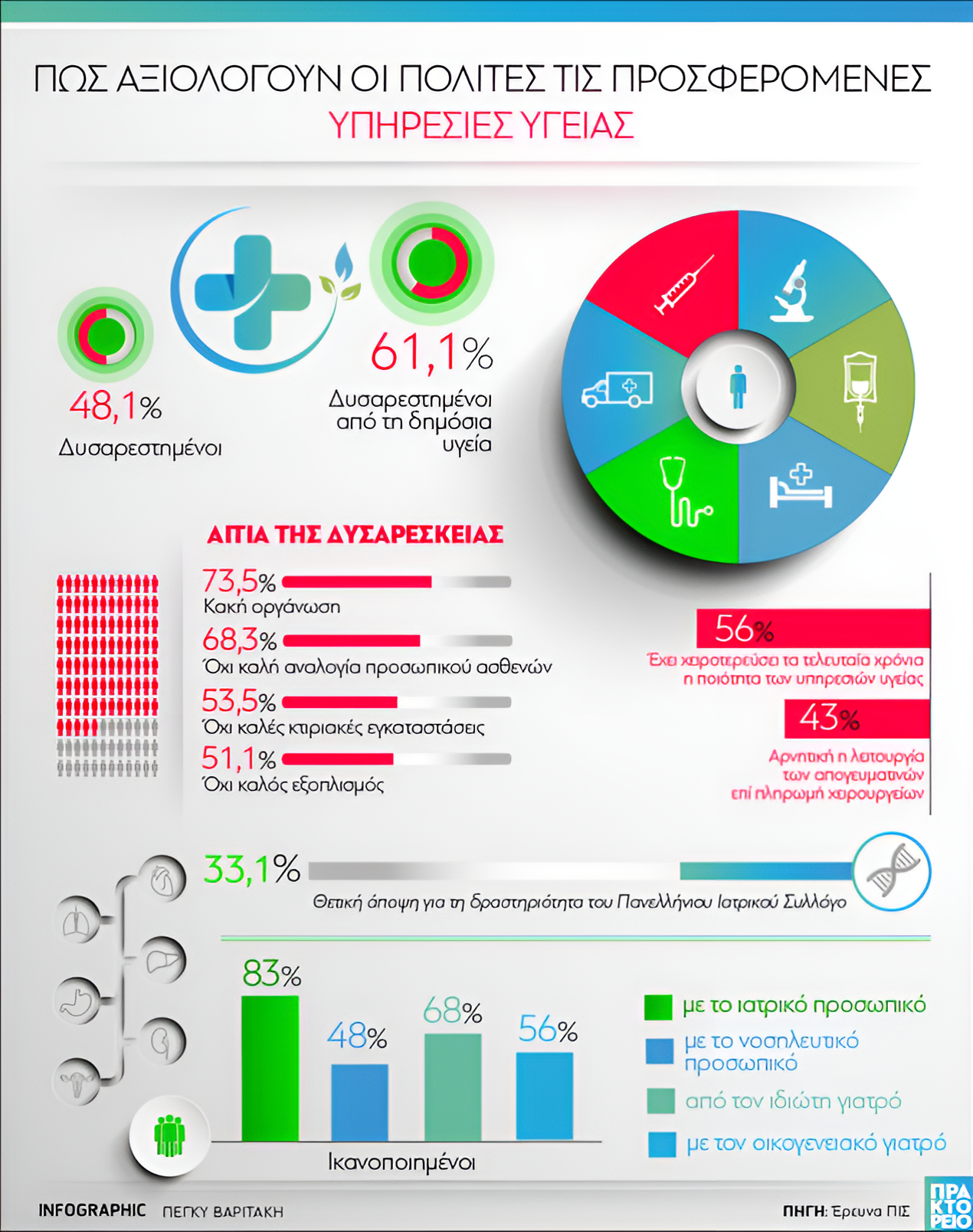 Παρά τη γενική δυσαρέσκεια, το 33,1% έχει θετική άποψη για τη δράση του Πανελλήνιου Ιατρικού Συλλόγου, ενώ ικανοποιητικά κρίνονται επιμέρους παράμετροι του συστήματος: