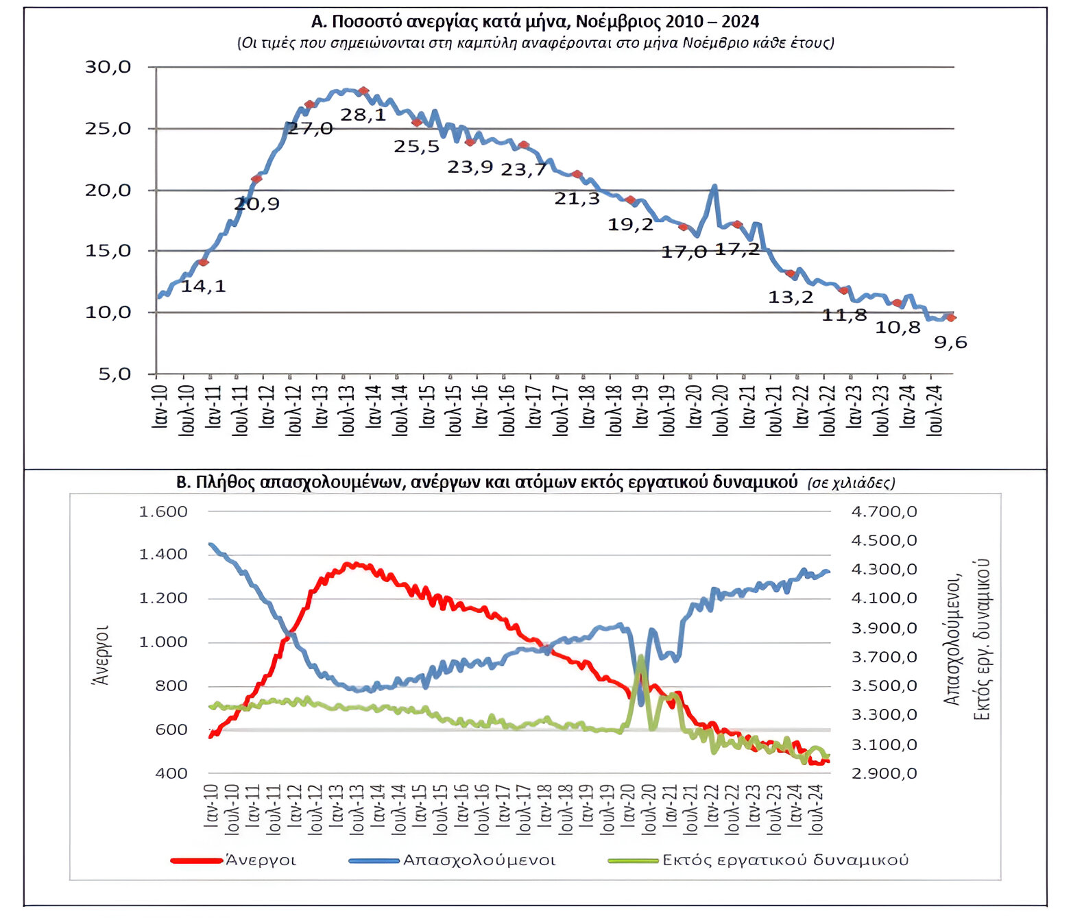 - Το ποσοστό ανεργίας διαμορφώθηκε στο 9,6% τον Νοέμβριο του 2024, έναντι 10,8% τον ίδιο μήνα του 2023 και 9,8% τον Οκτώβριο του 2024.