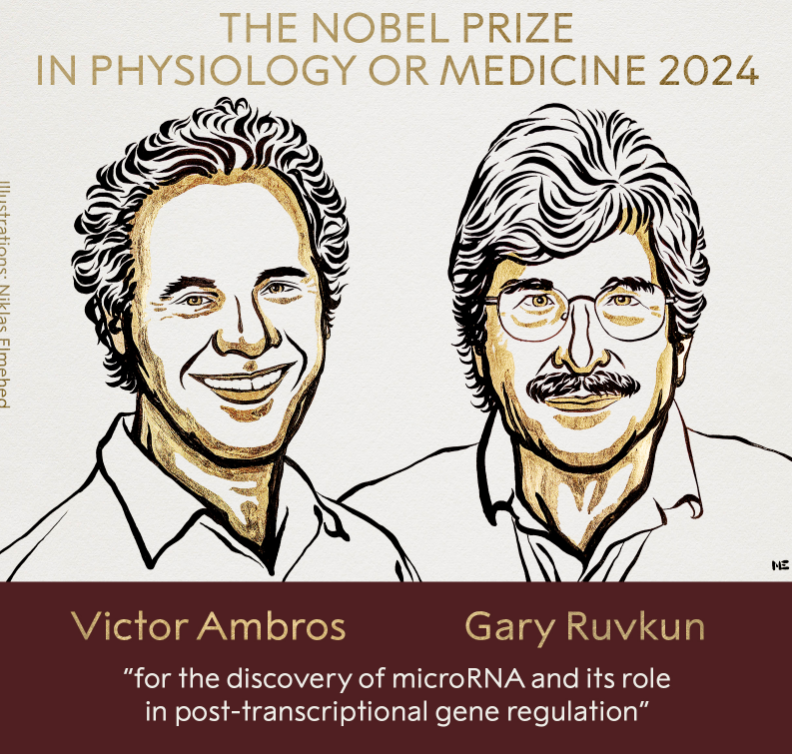Νόμπελ Ιατρικής του 2024: Οι Αμερικανοί επιστήμονες Βίκτορ Άμπρος και Γκάρι Ρούβκουν κέρδισαν το Νόμπελ Ιατρικής του 2024 για την ανακάλυψη του microRNA, μιας νέας κατηγορίας μικροσκοπικών μορίων RNA που παίζουν κρίσιμο ρόλο στη ρύθμιση των γονιδίων.