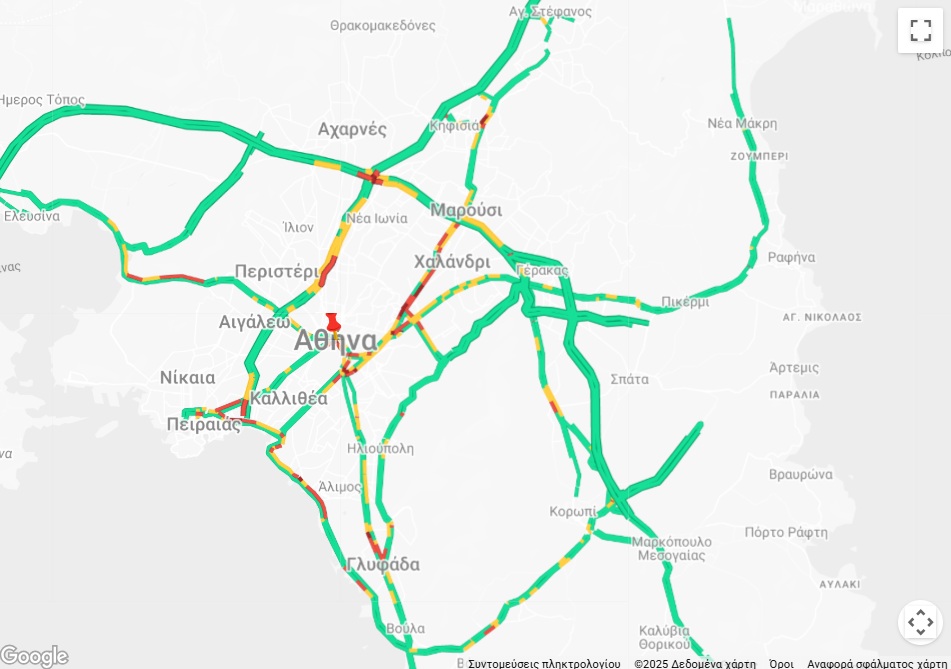 Σύμφωνα με την τελευταία εικόνα από τον χάρτη της Google, έντονη επιβράδυνση καταγράφεται και σε τμήματα της Καλλιθέας και της Λεωφόρου Ποσειδώνος, ενώ αυξημένη είναι η κίνηση και στις εισόδους του Πειραιά από τη Θηβών και τη Λαμπράκη.