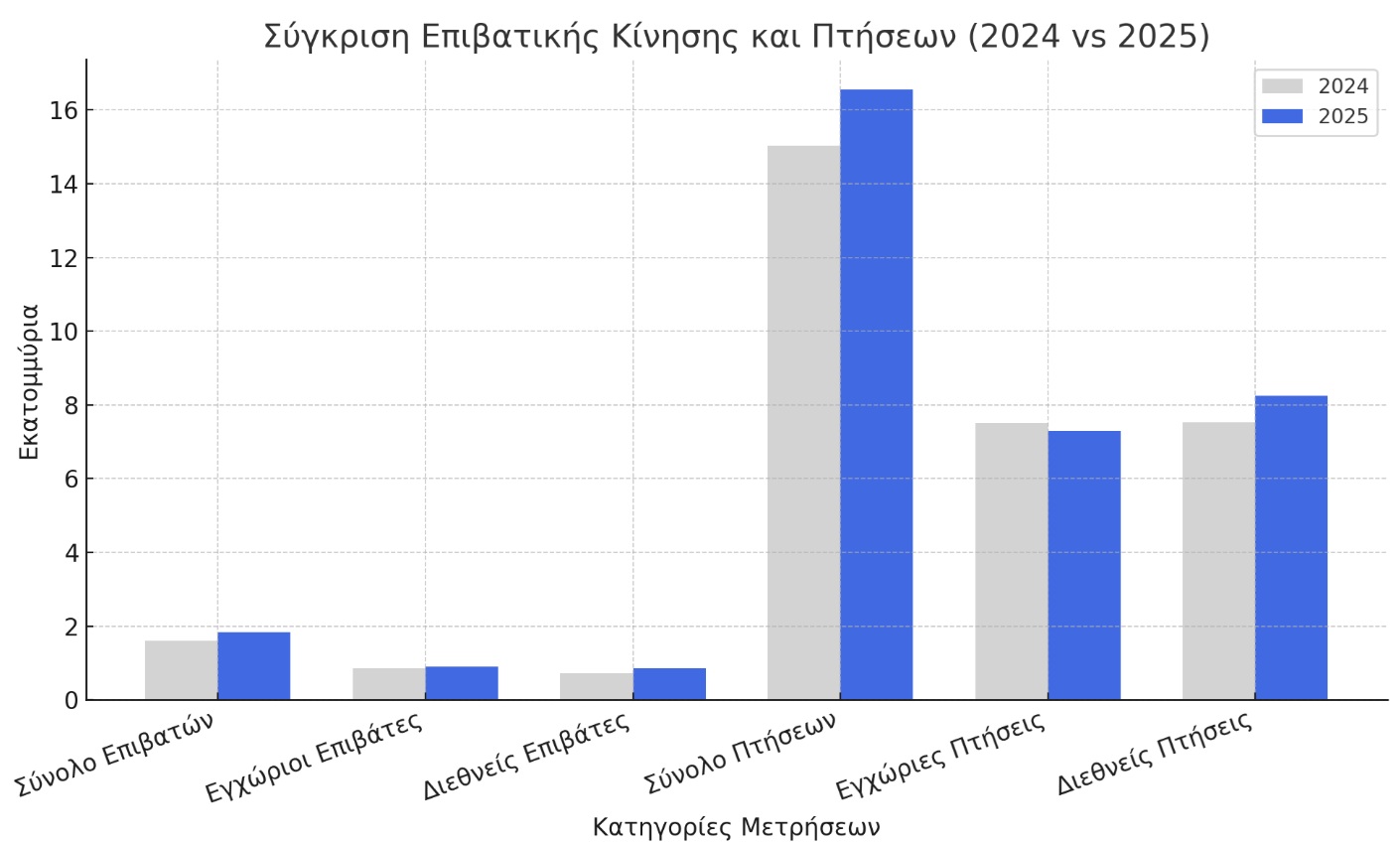 - Οι πτήσεις εσωτερικού μειώθηκαν κατά 2,5%, γεγονός που αντανακλά πιθανώς μια στροφή των ταξιδιωτών προς εναλλακτικές επιλογές μετακίνησης εντός Ελλάδας.