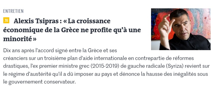 Με αφορμή τη συμπλήρωση επτά χρόνων από την έξοδο της Ελλάδας από τα μνημόνια, ο Αλέξης Τσίπρας παραχώρησε συνέντευξη στη γαλλική εφημερίδα Le Monde. Ο πρώην πρωθυπουργός έκανε έναν απολογισμό της πορείας της χώρας από την κρίση έως σήμερα, άσκησε κριτική στη σημερινή κυβέρνηση, αποκάλυψε ότι ετοιμάζει βιβλίο για το 2015, ενώ μίλησε και σε πιο προσωπικό τόνο για το πώς βιώνει την αποχώρησή του από την ενεργό πολιτική.