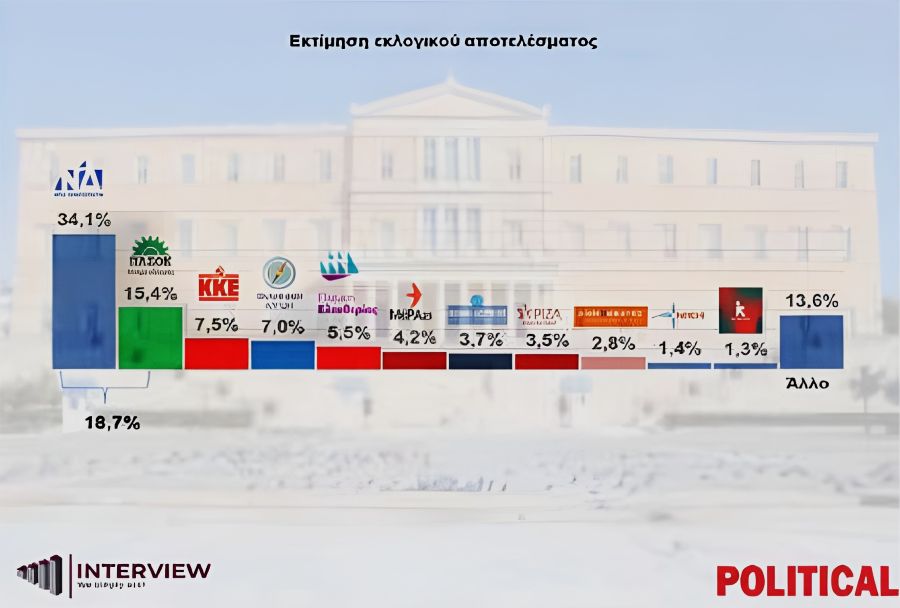 Δημοσκόπηση Interview: Στο 34,1% η ΝΔ – Μεγαλώνει η διαφορά από το ΠΑΣΟΚ