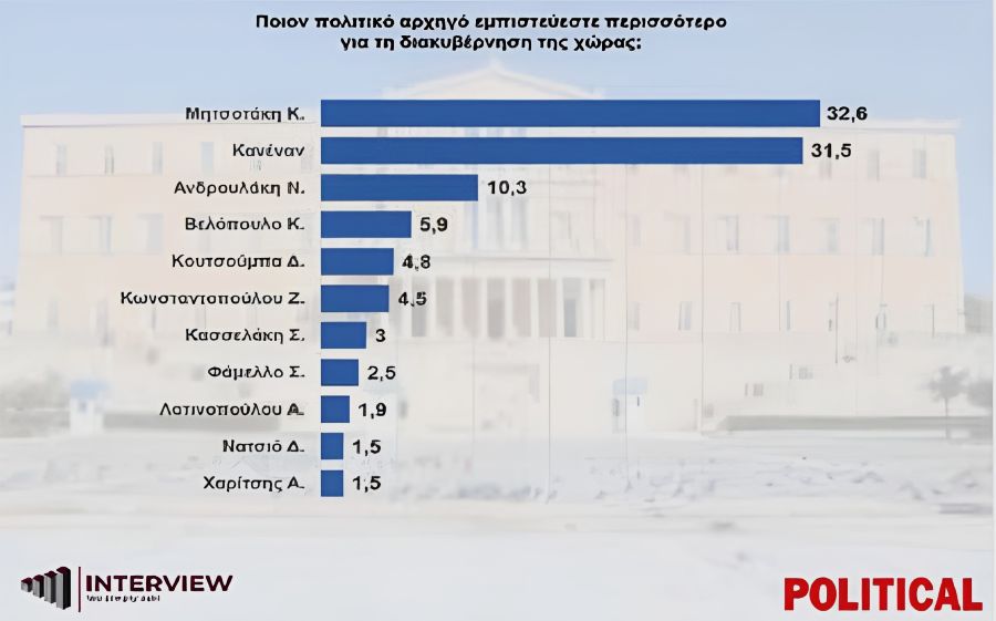 Στη δεύτερη θέση βρίσκεται η επιλογή «κανένας» με ποσοστό 31,5%, ενώ ακολουθεί ο πρόεδρος του ΠΑΣΟΚ Νίκος Ανδρουλάκης με 10,3%.