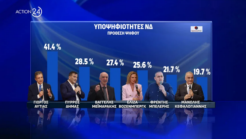 Η Opinion Poll είναι η πρώτη εταιρεία που δημοσιοποιεί στοιχεία για την μάχη του σταυρού στα δύο πρώτα κόμματα: Στη ΝΔ, πρώτος και με μεγάλη διαφορά εμφανίζεται ο Γιώργος Αυτιάς και ακολουθούν από απόσταση ο Πύρρος Δήμας, ο Βαγγέλης Μεϊμάράκης, η Ελίζα Βόζενμπεργκ και οι τρεις με μικρές διαφορές. Μετά ο Φρέντυ Μπελέρης, ο Μανώλης Κεφαλογιάννης και η Ελεονώρα Μελέτη, που αποτελούν μια τριάδα με μικρές διαφορές και κοντά στα ποσοστά.Ακολουθεί ο Δημήτρης Τσιόδρας. Την πρώτη δωδεκάδα συμπληρώνουν ο Στέλιος Κιμπουρόπουλος, η Βούλα Πατουλίδου, η Μαρία Σπυράκη και η Νόνη Δούνια.
