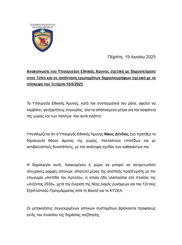 Το Υπουργείο διευκρινίζει επίσης, με σαφή υπαινιγμό προς τα ΜΜΕ, ότι οι μετακινήσεις συγκεκριμένων οπλικών συστημάτων δεν αποτελούν πεδίο δημόσιας συζήτησης, καθώς συνδέονται με διαβαθμισμένες επιχειρησιακές ανάγκες και δεν ανακοινώνονται δημοσίως.