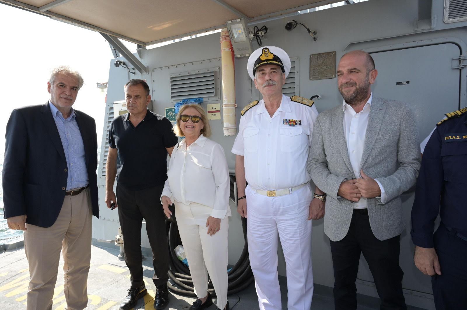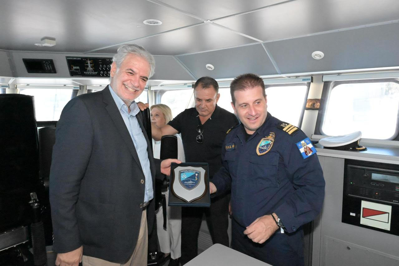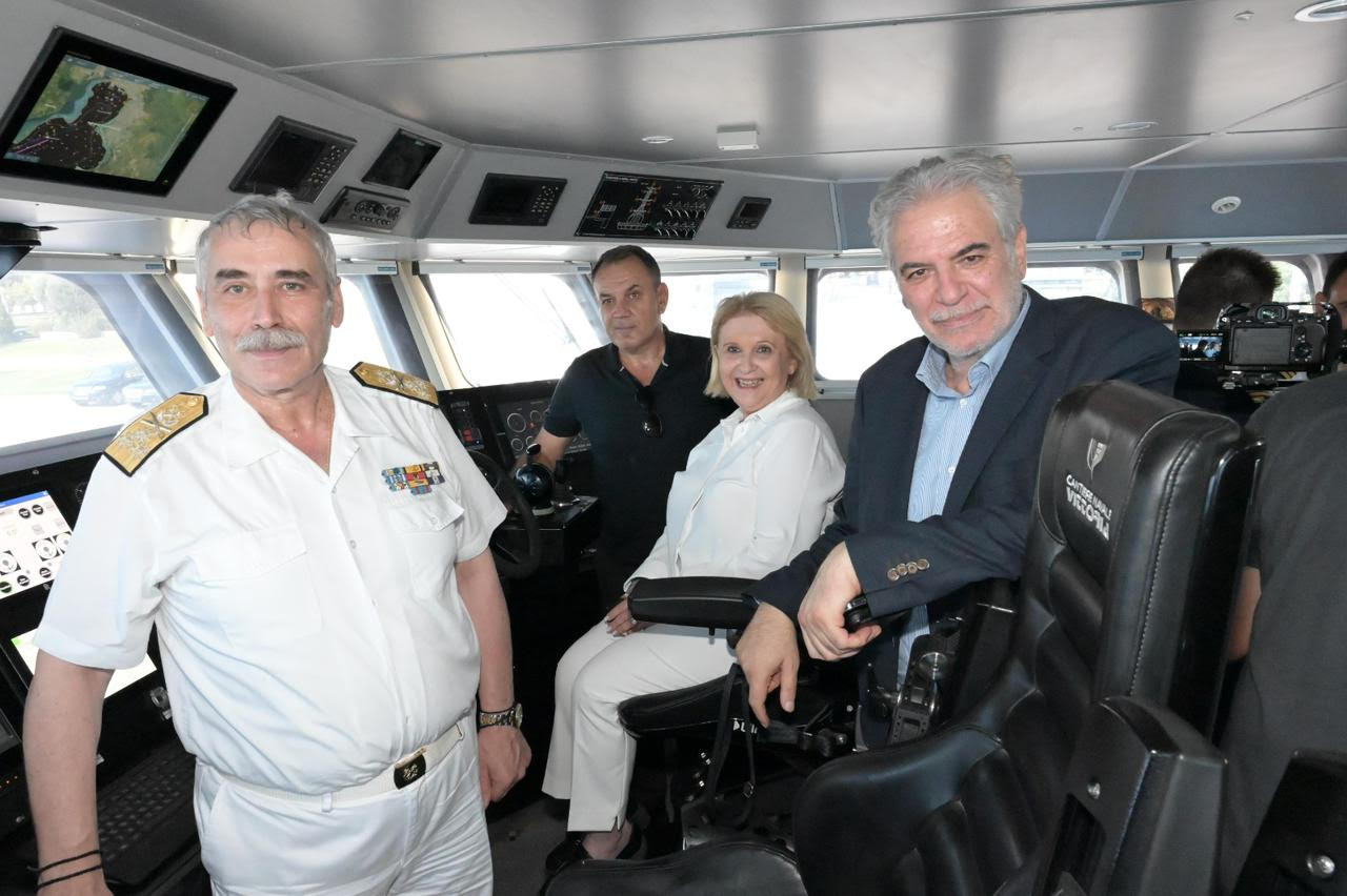 Οι δύο υπουργοί και η υφυπουργός αφού ενημερώθηκαν από τον κυβερνήτη υποπλοίαρχο ΛΣ Ανδρέα Τσέλη για τα χαρακτηριστικά και την αποστολή του, ξεναγήθηκαν στους χώρους του και επιθεώρησαν την γέφυρα.