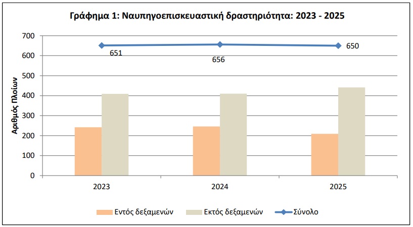 Η εικόνα της ελληνικής ναυπηγοεπισκευαστικής δραστηριότητας το 2025 δεν αποτυπώνει έκρηξη όγκου, αλλά μια πιο ουσιαστική μεταβολή: τη μετάβαση σε έργα μεγαλύτερης κλίμακας και υψηλότερης αξίας. Σύμφωνα με τα στοιχεία της ΕΛΣΤΑΤ, ο αριθμός των επισκευασθέντων πλοίων διαμορφώθηκε στα 650, σημειώνοντας οριακή μείωση σε σχέση με το 2024.
