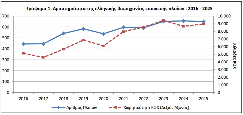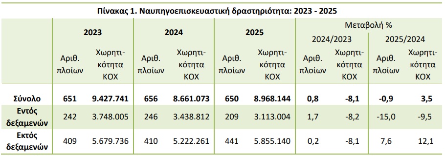 Ωστόσο, πίσω από τη σταθερότητα των αριθμών κρύβεται μια σημαντική διαφοροποίηση. Η συνολική χωρητικότητα των πλοίων που επισκευάστηκαν αυξήθηκε κατά 3,5%, φτάνοντας τα 8,96 εκατ. κόρους ολικής χωρητικότητας. Με απλά λόγια, λιγότερα πλοία, αλλά μεγαλύτερα και πιο απαιτητικά.