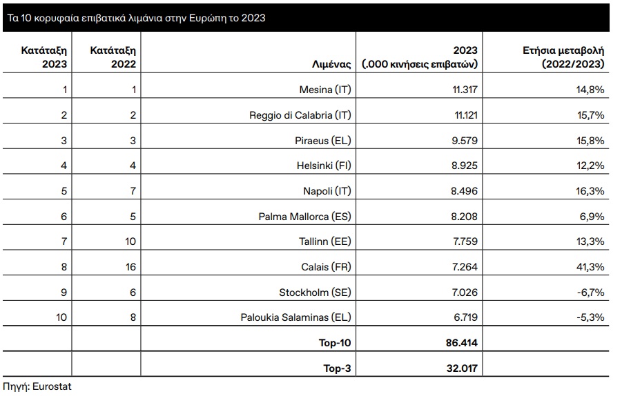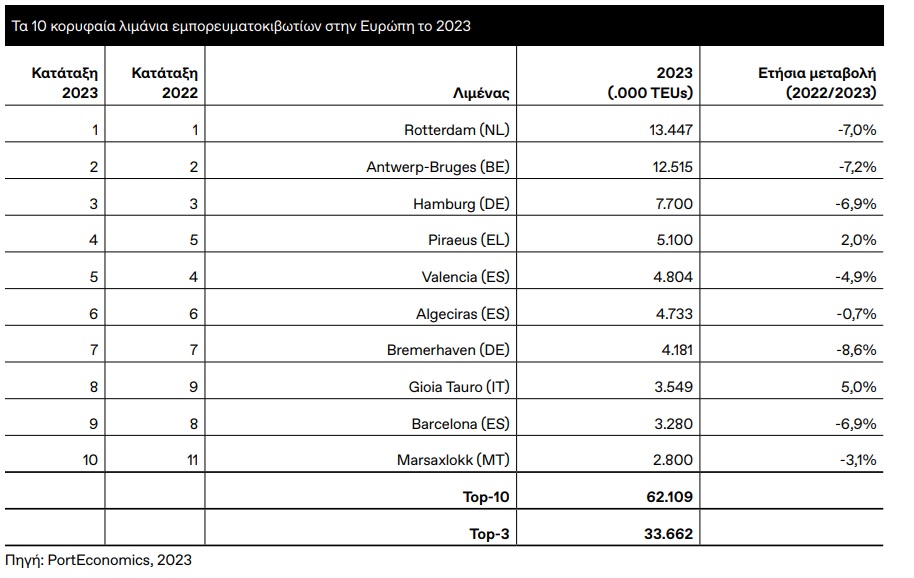 Ο Πειραιάς κατέλαβε την 4η θέση μεταξύ των μεγαλύτερων ευρωπαϊκών λιμανιών, ξεπερνώντας τη Βαλένθια, ενώ παραμένει ο δεύτερος μεγαλύτερος λιμένας στη Μεσόγειο, πίσω από το Tangier Med. Στο παγκόσμιο επίπεδο, βρίσκεται πλέον στη 37η θέση, διατηρώντας, όμως, τον ρόλο του ως στρατηγικός κόμβος.