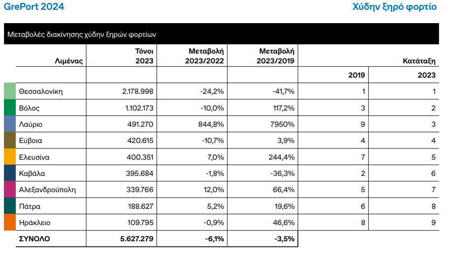 - Η διακίνηση χύδην υγρών φορτίων κατέγραψε αύξηση 46,6% σε σχέση με το 2019, ενώ η συνολική εμπορευματική κίνηση παραμένει σταθερή