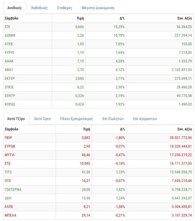 Αντίθετα, οι μετοχές εταιρειών ενέργειας, κατασκευών και επιλεγμένων τίτλων μεσαίας κεφαλαιοποίησης εμφάνισαν θετικές μεταβολές. Ξεχώρισαν η ΓΕΚ Τέρνα, η ΔΕΗ και ο Τιτάνας, ενώ ισχυρή άνοδο κατέγραψαν και εταιρείες όπως η Δομική Κρήτης και η Frigoglass.