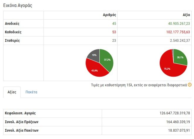 Η συνολική κεφαλαιοποίηση του Χρηματιστηρίου αυξήθηκε κατά 4,16 δισ. ευρώ, φτάνοντας τα 126,6 δισ. ευρώ, ενώ οι συναλλαγές ανήλθαν σε 1,07 δισ. ευρώ την εβδομάδα με μέση ημερήσια αξία 214 εκατ. ευρώ, αυξημένη σε σχέση με την προηγούμενη εβδομάδα.