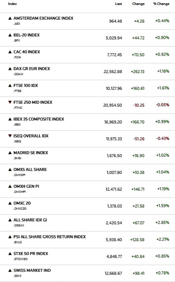 Στις μεγάλες αγορές, ο FTSE 100 στο Λονδίνο ενισχύθηκε κατά 1,61% στις 10.127,96 μονάδες, ο CAC 40 στο Παρίσι κινήθηκε υψηλότερα κατά 0,92% στις 7.772,45 μονάδες, ενώ ο DAX στη Φρανκφούρτη κατέγραψε άνοδο 1,18% στις 22.562,88 μονάδες.