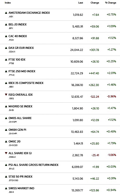 Σε τροχιά ανόδου κινήθηκαν τα ευρωπαϊκά χρηματιστήρια, με τους βασικούς δείκτες να καταγράφουν ισχυρά κέρδη, καθώς οι επενδυτές επιχειρούν να ισορροπήσουν ανάμεσα στις ενδείξεις αποκλιμάκωσης της ενεργειακής κρίσης και τη συνεχιζόμενη γεωπολιτική αβεβαιότητα.