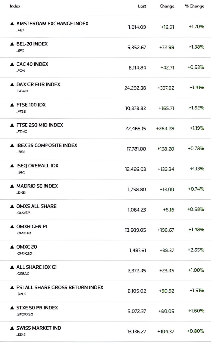 Η εικόνα ήταν συγχρονισμένα θετική στα μεγάλα ευρωπαϊκά χρηματιστήρια, με τον FTSE 100 στο Λονδίνο να καταγράφει άνοδο άνω του 1,6%, τον DAX στη Φρανκφούρτη να κινείται επίσης δυναμικά ανοδικά και τον CAC 40 στο Παρίσι να ακολουθεί με πιο συγκρατημένα κέρδη. Στην περιφέρεια, οι δείκτες της Ιταλίας και της Ισπανίας επιβεβαίωσαν το θετικό momentum, σε μια αγορά που δείχνει να «χωνεύει» σταδιακά τα ρίσκα.