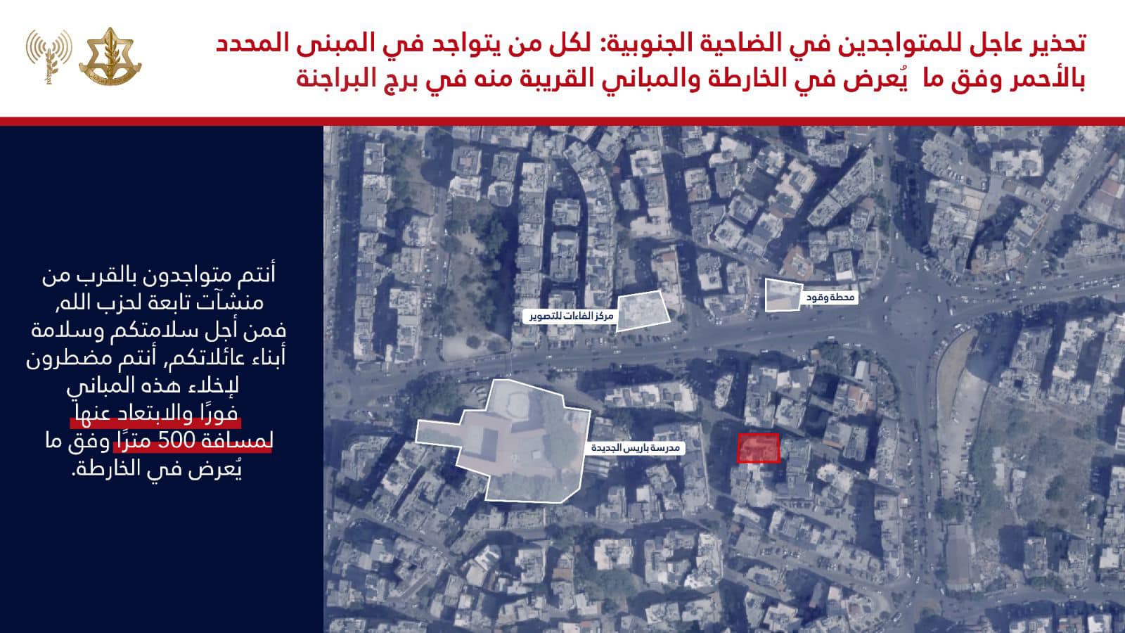 Νωρίτερα ο αραβόφωνος εκπρόσωπος των IDF, Αβιχάι Αντράι σε ανάρτησή του στο Χ, κάλεσε τους κατοίκους σε συγκεκριμένα κτίρια στις περιοχές Burj el-Barajneh, Al-Layliki και Haret Hreik στα νότια προάστια της Βηρυτού να εκκενώσουν.