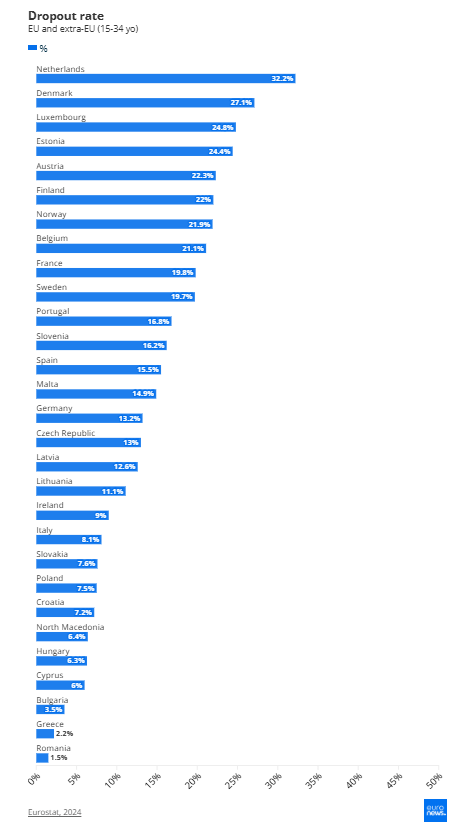 Η Ολλανδία καταγράφει το υψηλότερο ποσοστό εγκατάλειψης της εκπαίδευσης στην Ευρωπαϊκή Ένωση, με το 32% των νέων να δηλώνουν ότι έχουν διακόψει σπουδές ή κατάρτιση τουλάχιστον μία φορά. Στη δεύτερη και τρίτη θέση ακολουθούν η Δανία (27%) και το Λουξεμβούργο (25%).