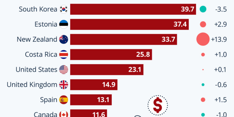 Στο Ηνωμένο Βασίλειο, το ποσοστό παρέμεινε γύρω στο 15%, ενώ στον Καναδά διαμορφώθηκε λίγο κάτω από το 12%.
