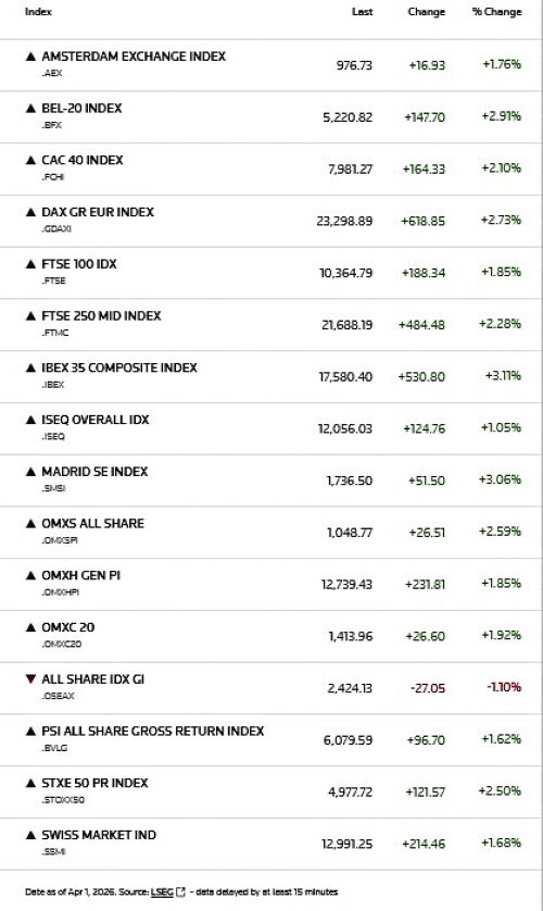 Στην πρώτη γραμμή της ανόδου βρίσκονται οι βασικοί ευρωπαϊκοί δείκτες, με τον γερμανικό DAX να ενισχύεται κατά +2,73%, καταγράφοντας μία από τις ισχυρότερες ημερήσιες επιδόσεις. Παρόμοια δυναμική εμφανίζει και ο ισπανικός IBEX 35, ο οποίος σημειώνει άνοδο +3,11%, επιβεβαιώνοντας τη διάχυση της ανόδου σε όλο το εύρος της αγοράς.