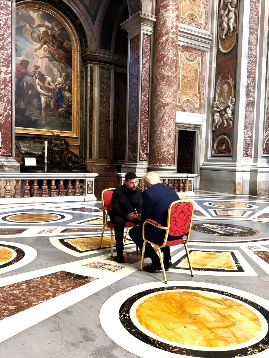 Οι δύο ηγέτες συνομίλησαν για περίπου 15 λεπτά μέσα στη Βασιλική του Αγίου Πέτρου, χωρίς την παρουσία συμβούλων, σε ένα τετ-α-τετ που το Κίεβο χαρακτήρισε «καλό» και ο Λευκός Οίκος «πολύ εποικοδομητικό». Το στιγμιότυπο της συνομιλίας τους, όπου σκύβουν κοντά ο ένας στον άλλον, δόθηκε στη δημοσιότητα και από τις δύο πλευρές.